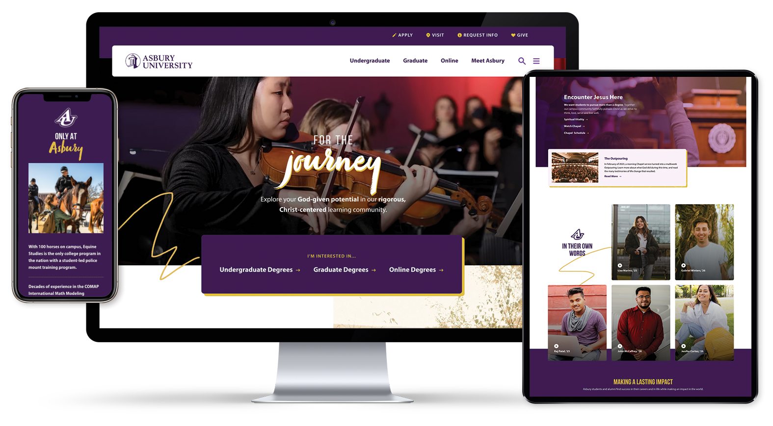 “The new Asbury.edu site is a game-changer for enrollment. Prospective students now experience a much clearer, more compelling digital journey — one that reflects who we are… and makes it easier to explore programs, connect with admissions, and take next steps. In a highly competitive market, this site helps us stand out and better serve both students and parents who are making one of the most important decisions of their lives.”