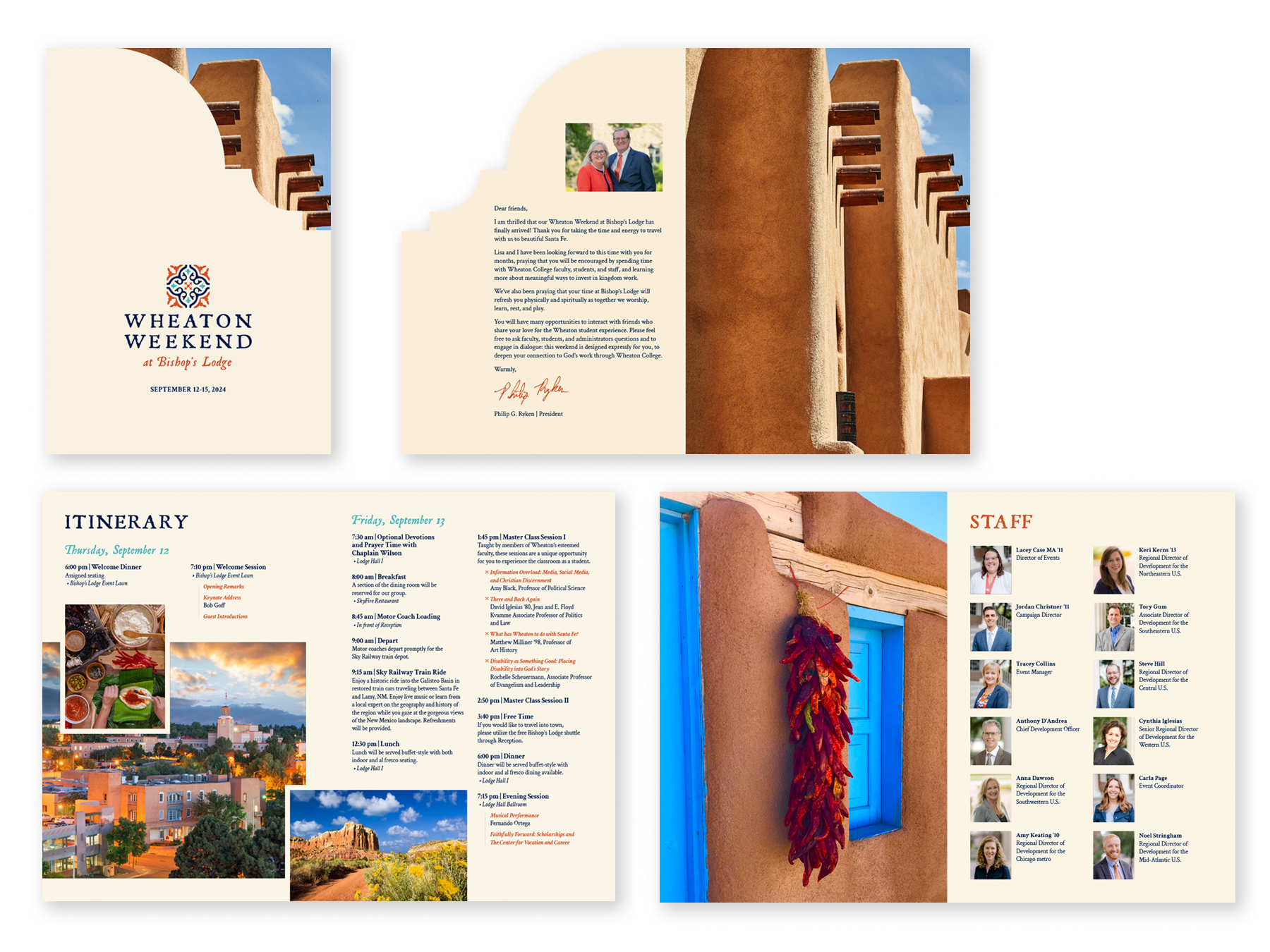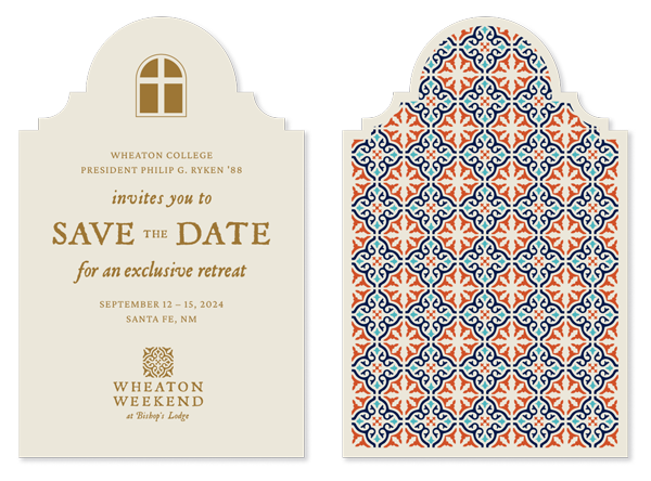 5° was asked to develop invitation and program materials for the Wheaton Weekend at Bishop's Lodge in Santa Fe, New Mexico, a four-day donor engagement retreat. The purpose of the retreat was to enhance their insider perspective of Wheaton's mission and vision for the future and explore how they could best invest in Wheaton students during the leadership phase of the current capital campaign. The weekend resulted in gifts and pledges of over $4.2M.